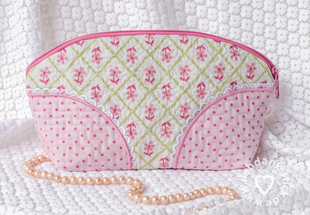 Diese hübsche Kosmetiktasche wird teilweise mit der Stickmaschine angefertigt und am Schluss mit der Nähmaschine genäht. Eine Schritt für Schritt Anleitung ist dabei.