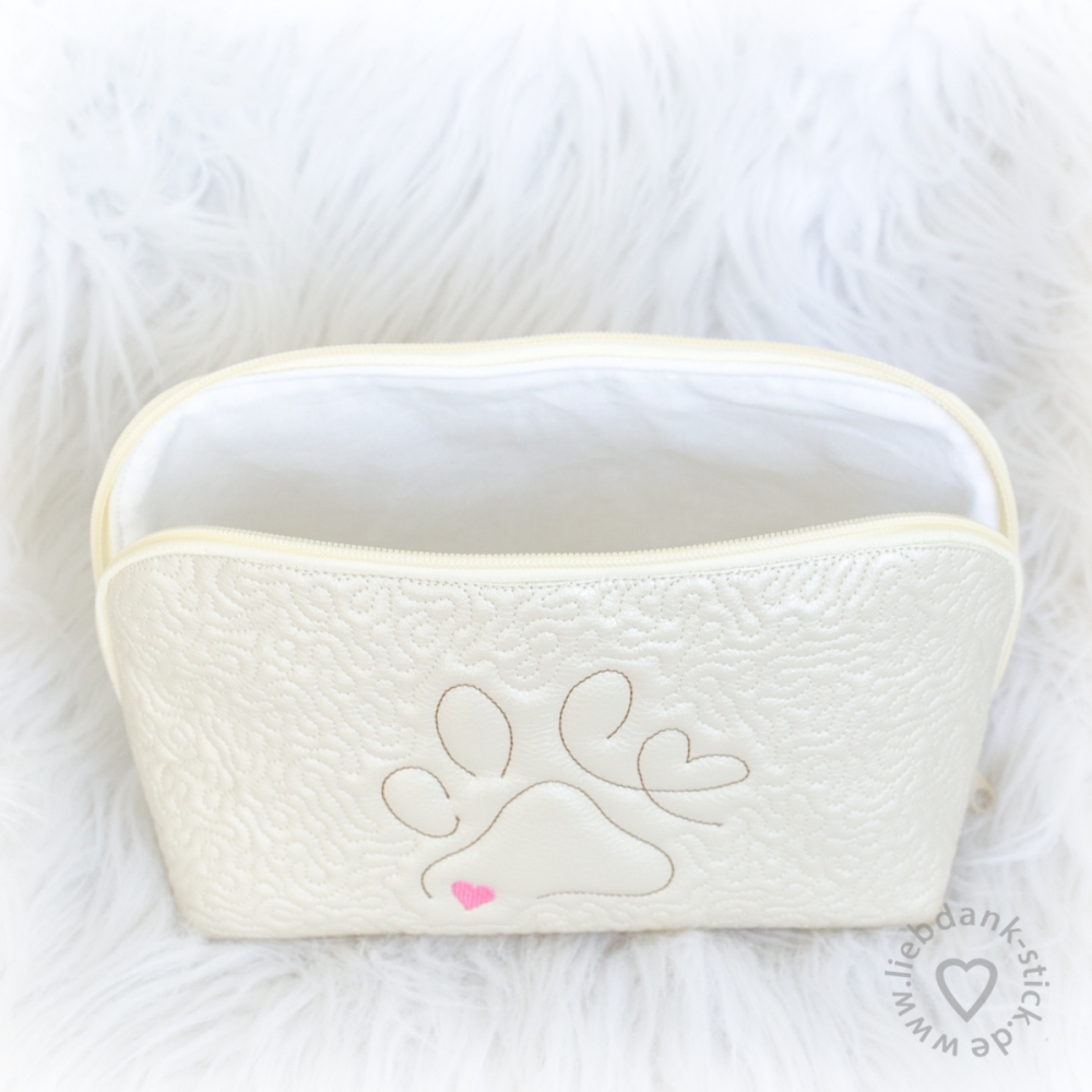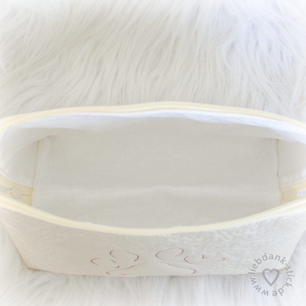 Diese hübsche Kosmetiktasche wird teilweise mit der Stickmaschine angefertigt und am Schluss mit der Nähmaschine genäht. Eine Schritt für Schritt Anleitung ist dabei.