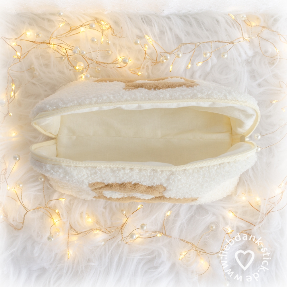 Wichtig zu wissen: Das Gesicht des Alpakas wird nicht appliziert. Das bedeutet, dass die Farbe des Taschenstoffs gleichzeitig die Gesichtsfarbe des Alpakas wird. Deshalb lohnt es sich, einen Stoff auszuwählen, dessen Farbton gut zu einem süßen Alpaka-Gesicht passt.