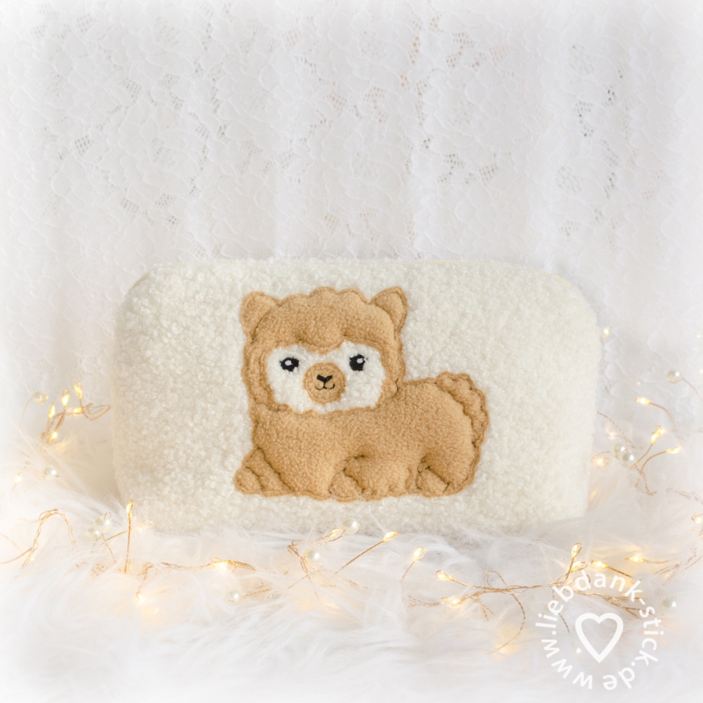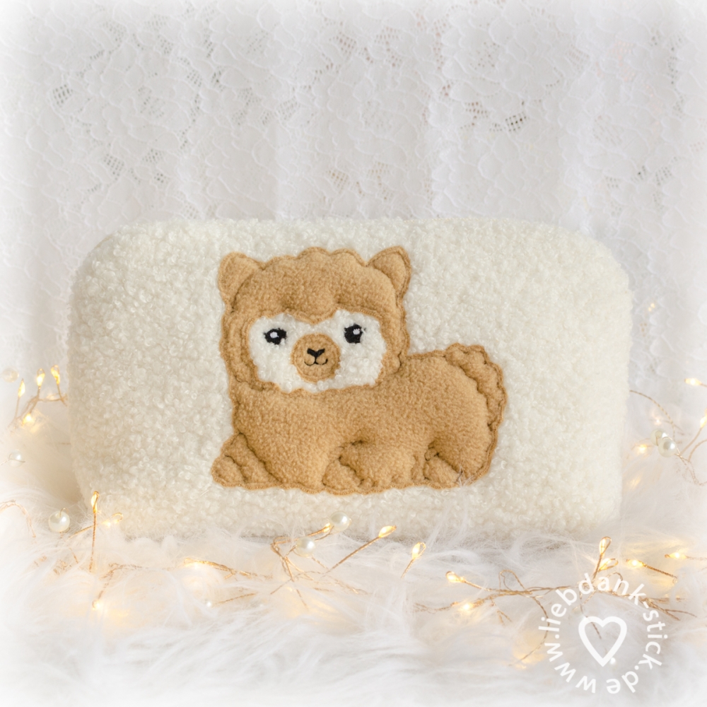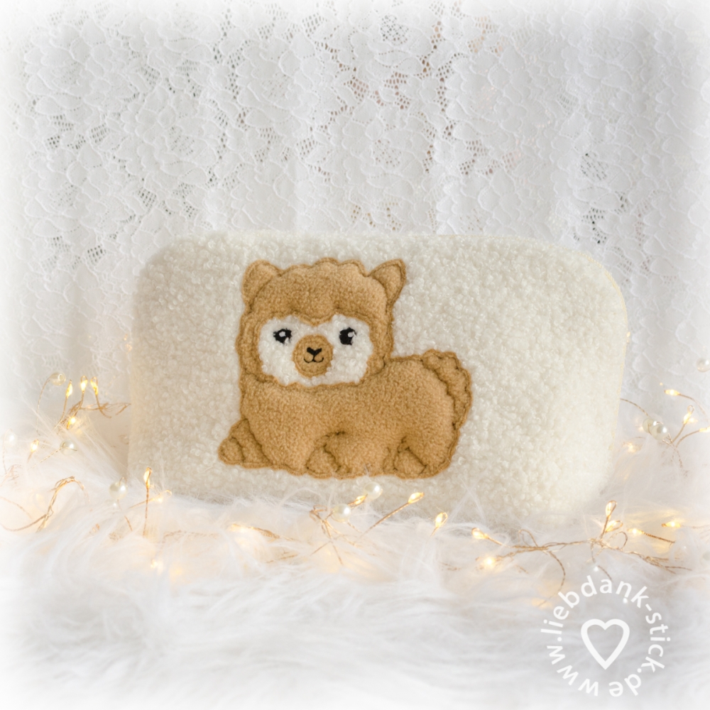 Wichtig zu wissen: Das Gesicht des Alpakas wird nicht appliziert. Das bedeutet, dass die Farbe des Taschenstoffs gleichzeitig die Gesichtsfarbe des Alpakas wird. Deshalb lohnt es sich, einen Stoff auszuwählen, dessen Farbton gut zu einem süßen Alpaka-Gesicht passt.