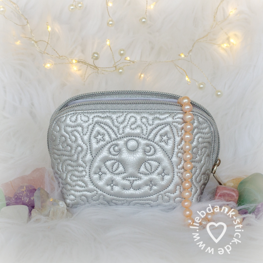 Diese hübsche Kosmetiktasche wird teilweise mit der Stickmaschine angefertigt und am Schluss mit der Nähmaschine genäht. Eine Schritt für Schritt Anleitung ist dabei.